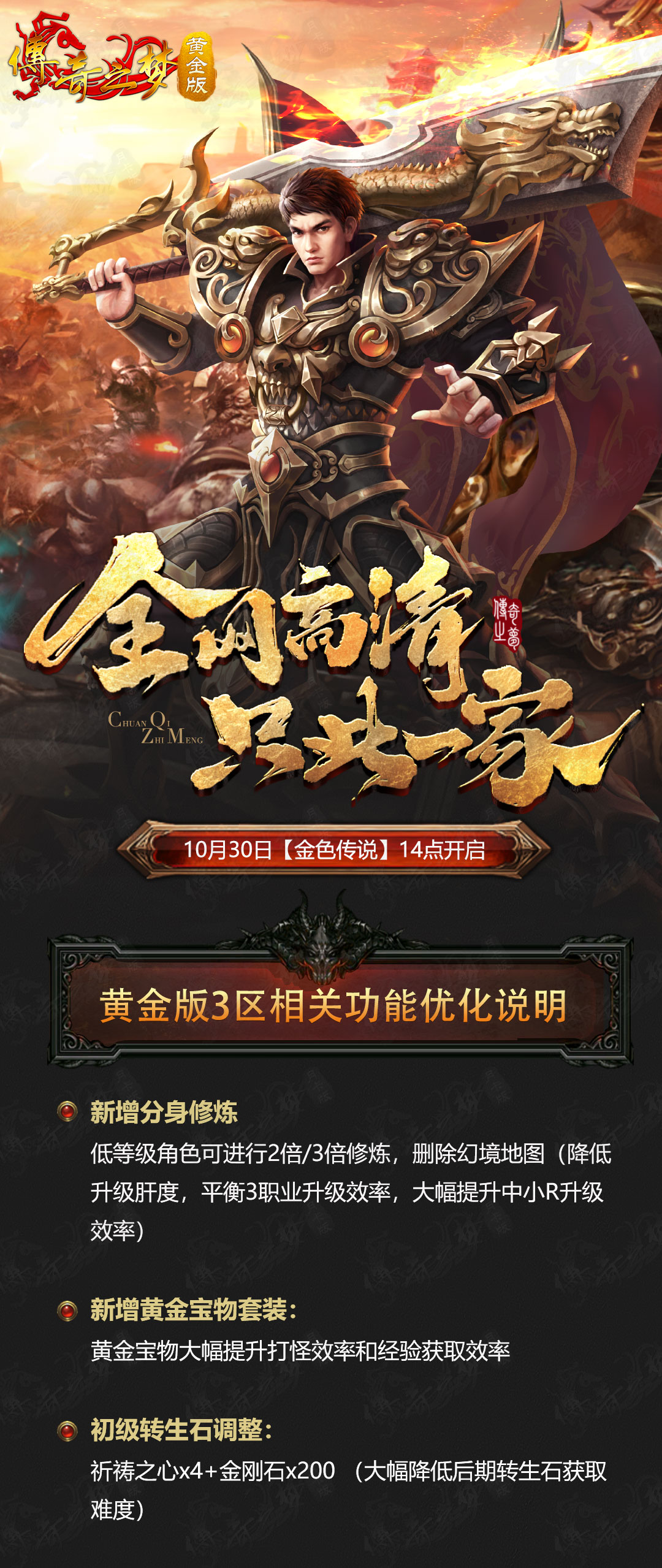 《传奇之梦》黄金版新区【金色传说】将于10月30日盛大开服!新区新气象,诸多功能优化全面降低肝度!降肝度升激情,玛法大陆等你一战!